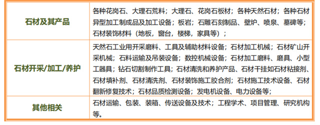 60%為國際參展商。展出各類天然石材、石材制品、石材加工設備、機械、工具、養護設備等產品。