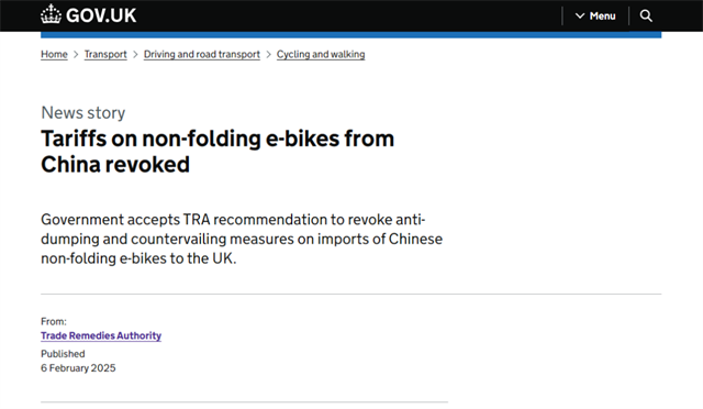 英國貿(mào)易救濟局取消懲罰性關(guān)稅原文鏈接:https://www.gov.uk/government/news/tariffs-on-non-folding-e-bikes-from-china-revoked